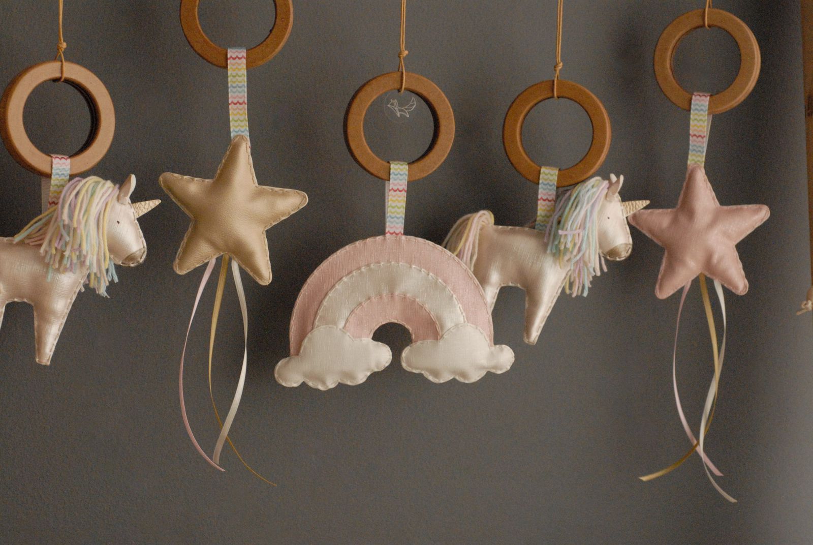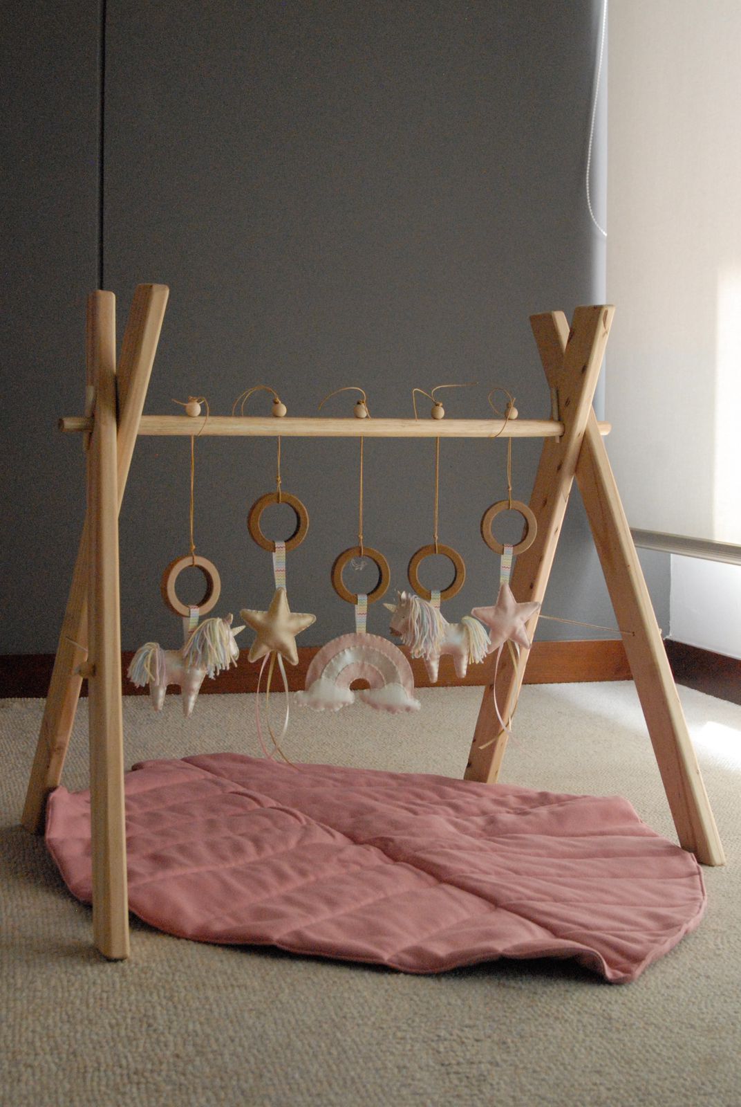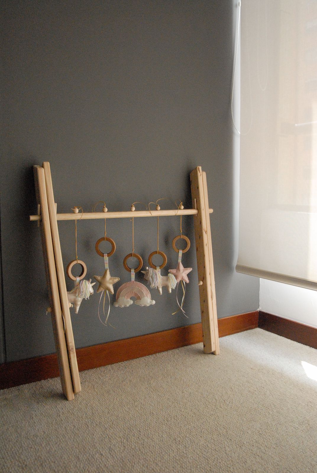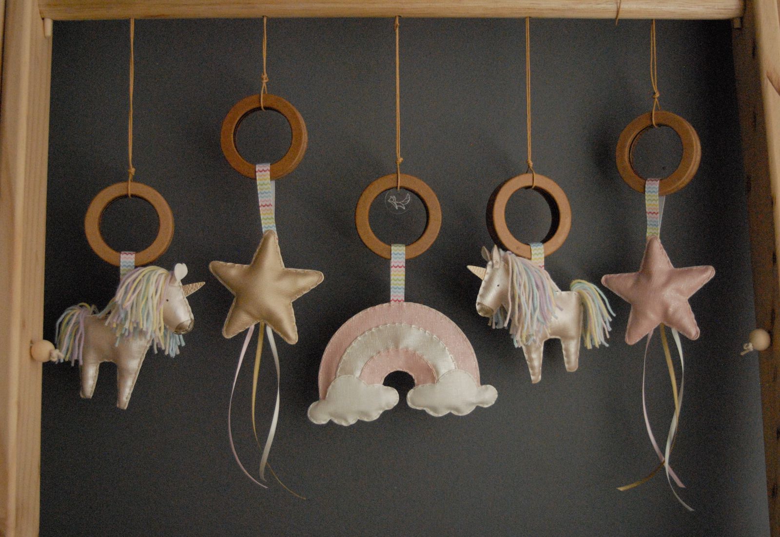 Incluye 5 juguetes colgantes de diferentes tamaños y texturas donde podrán estimular sus sentidos .Tiene dos estacas en MDF para ajustar en cada lado.