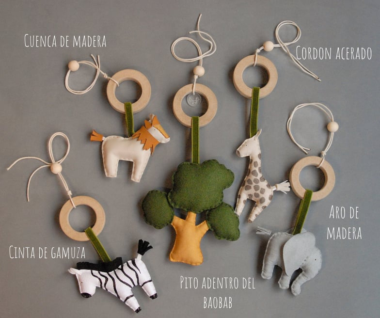 Incluye 5 juguetes colgantes de diferentes tamaños y texturas donde podrán estimular sus sentidos.( Zebra, Elefante, Leon, Jirafa y el Baobab. )